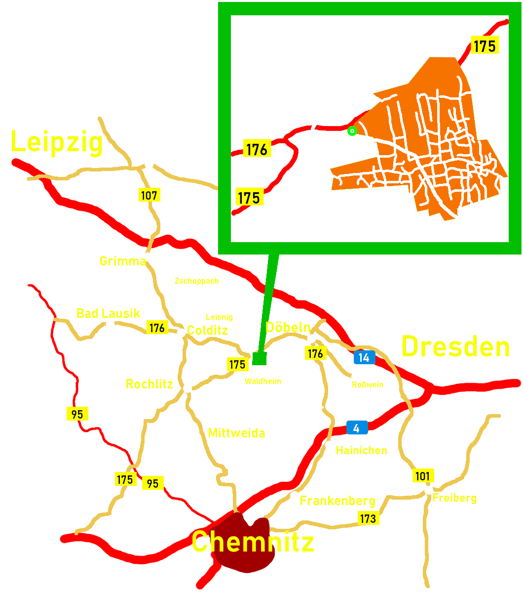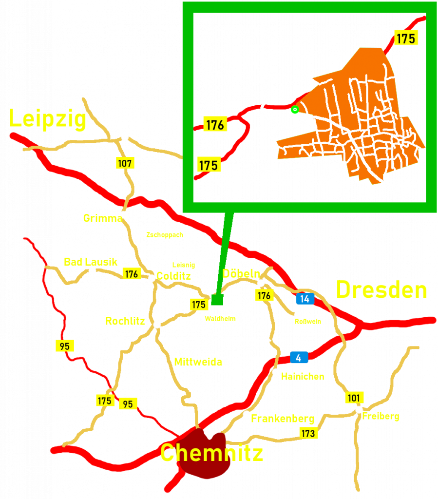 Lage & Anfahrt Standort: Töpelstr. 49, 04746 HarthaGPS: L = 12°57’39,6 “ ö.L. ; B = + 51°06’09“ n.B. ; H = 324 m ü. NN